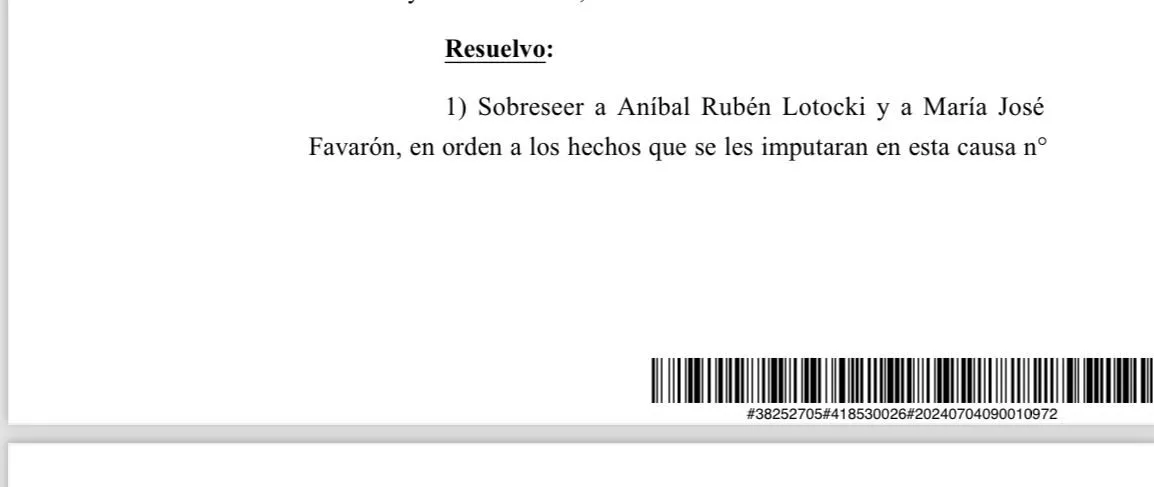 El juez decidió sobreseer tanto a Lotocki como a su esposa, dejando en claro que no se había comprobado ningún delito. También aclaró que el proceso no debía afectar el buen nombre y honor de los acusados.